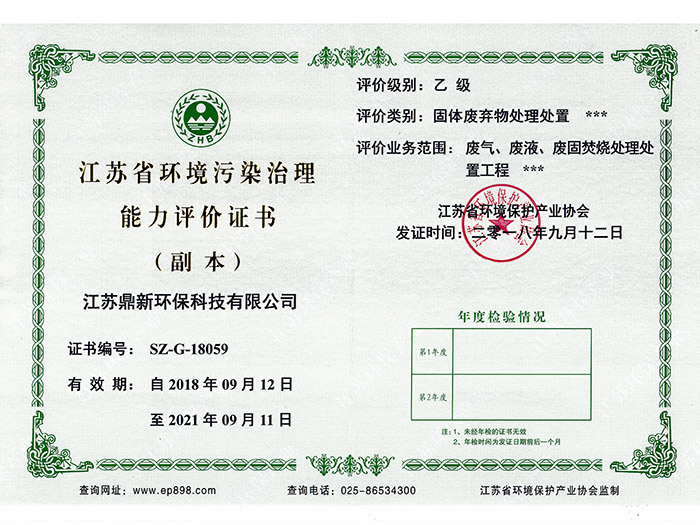 当前位置:首页 > 客户服务 > 荣誉资质 > 江苏环境污染治理能力评价书-乙级